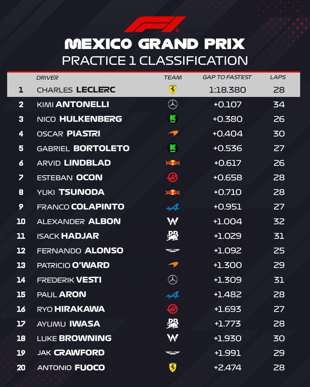 In una sessione di prove libere caratterizzata dalla presenza di ben nove rookies ad ottenere il miglior tempo, in 1’18″380, è stato Charles Leclerc. Il monegasco della Ferrari, reduce dal bel podio di Austin, ha preceduto la Mercedes di Kimi Antonelli e la Kick Sauber di Nico Hülkenberg, mentre il leader della classifica iridata Oscar Piastri (McLaren) ha concluso al quarto posto a poco più di quattro decimi dalla vetta. Chiude la top 5 Gabriel Bortoleto, alla guida della seconda Kick Sauber.