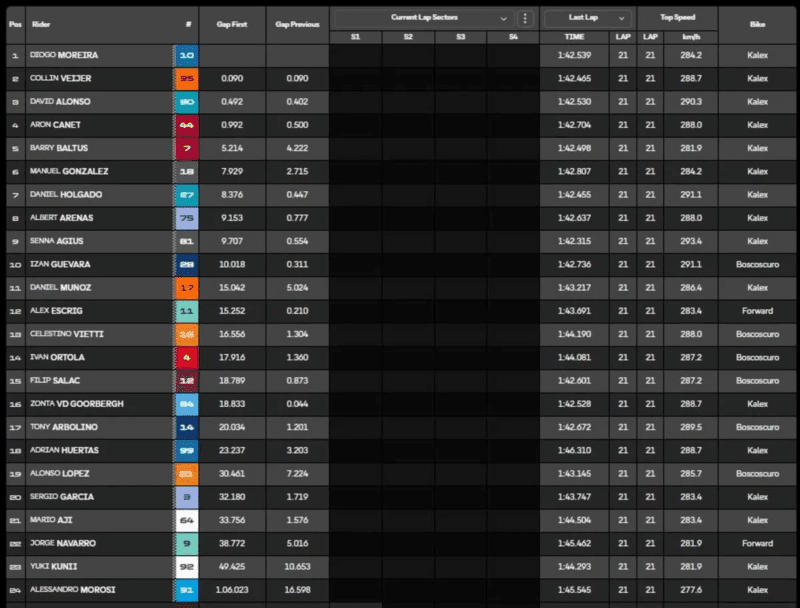 Medaglia di legno per il rider Fantic Aron Canet, spettatore illustre della lotta per la vittoria; segue il compagno di squadra Barry Baltus. Festeggia anche Daniel Holgado (CFMOTO Inde Aspar Team) che con il 7° posto al traguardo conquista il titolo di Rookie of The Year. Spazio in top10 anche per il rimontante Albert Arenas, Senna Agius e Izan Guevara. Crolla nel finale Celestino Vietti, soltanto 13°. Chiude la zona punti il ceco Filip Salac, autore di un uscita di pista nel corso del primo giro, peggio va al compagno Dixon, finito a terra. Sorte analoga per Ramirez e Sasaki. Fine settimana da dimenticare per Tony Arbolino, 17° al traguardo.
