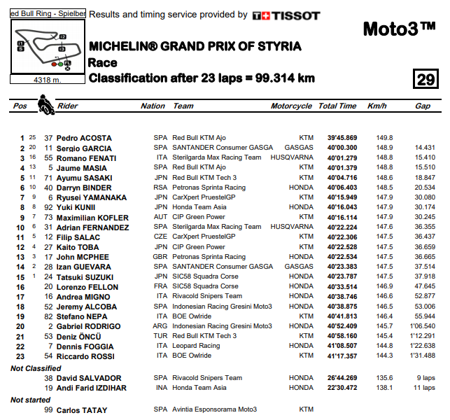 La gara di Moto3 odierna è stata segnata dalla pioggia che è arrivata, copiosa, sul tracciato del Red Bull Ring. In un GP Stiria che ha fatto saltare al banco le strategie, il talento del giovanissimo Pedro Acosta è nuovamente venuto fuori, permettendogli di conquistare la quinta vittoria stagionale. Un GP Stiria meravigliosamente gestito per il leader del mondiale, che è stato consistente per tutti i 23 giri senza mai commettere una sbavatura.