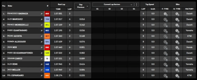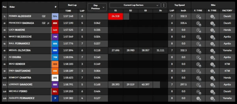 Terza fila con Joan Mir (Honda HRC Castrol) settimo, davanti a Fabio Di Giannantonio (Pertamina Enduro VR46 Racing Team) ed il francese Johann Zarco (Castrol Honda LCR). Decima la seconda Yamaha di Alex Rins. Scatterà 13° Luca Marini (Honda HRC Castrol), più indietro Enea Bastianini, il più lento in sella alla moto austriaca.
