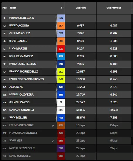 Sorrisi anche nei box KTM con Pedro Acosta secondo al traguardo, dopo una partenza a razzo e una bella lotta con Alex. Poco più dietro Brad Binder, 4° appena davanti a Luca Marini che deve fare i conti con una lotta piuttosto serata con Raul Fernandez (6°) che di fatto ha rallentato entrambi. Spazio in top ten per le Yamaha ufficiali di Quartararo e Rins, rispettivamente in settima e decima posizione, tra i due Morbidelli e Di Giannantonio (Pertamina Enduro VR46 Racing Team). 11° Miguel Oliveira (Prima Pramac Yamaha).