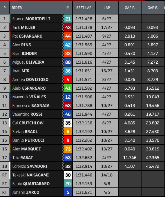 Undicesima posizione per Pecco Bagnaia, che precede di poco il mentore Valentino Rossi. A chiudere la zona punti Cal Crutchlow, Stefan Bradl e Danilo Petrucci. Sedicesima posizione per l’infortunato Alex Marquez, poi Tito Rabat e Lorenzo Savadori.