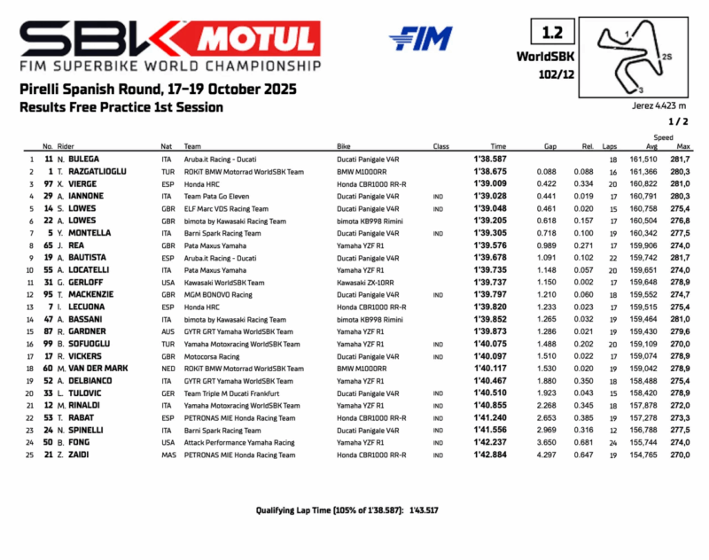 Nicolò Bulega (Aruba.it Racing – Ducati) è il più veloce al termine delle FP1 del Round Pirelli di Spagna, al Circuito de Jerez – Angel Nieto. Parte con il piede giusto la ricorsa al titolo dell’italiano, bravo a precedere di 88 millesimi Toprak Razgatlioglu (ROKiT BMW Motorrad WorldSBK Team) che ben si difende considerano i 39 punti di vantaggio che detiene. Terzo miglior crono per Xavi Vierge (Honda HRC) che paga però oltre 4 decimi dal ducatista.