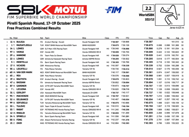 Il venerdì Round Pirelli di Spagna del Campionato del Mondo MOTUL FIM Superbike si chiude con Nicolò Bulega (Aruba.it Racing – Ducati) davanti a tutti. Il pilota italiano si conferma velocissimo nonostante alcune noie tecniche. Si conferma secondo il turco Toprak Razgatlioglu (ROKiT BMW Motorrad WorldSBK Team) non brillante al pomeriggio, appena davanti all’inglese Sam Lowes (ELF Marc VDS Racing Team) con la seconda migliore Ducati. Quarta la prima Honda di Xavi Vierge, davvero efficace al mattino.