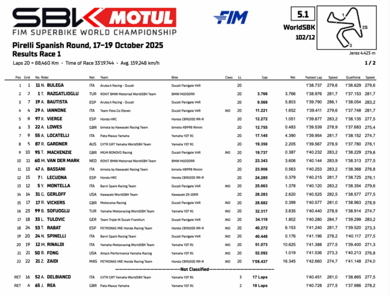 Dopo aver conquistato una fantastica Superpole, Nicolò Bulega (Aruba.it Racing – Ducati) è autore del successo in Gara 1 al Circuito de Jerez – Angel Nieto. Una vittoria senza alcuna esitazione, visto l’importante distacco con cui ha preceduto sul traguardo Toprak Razgatlioglu (ROKiT BMW Motorrad WorldSBK Team) che cercherà di non commettere errori per conquistare l’iride domani, al termine della Superpole Race.