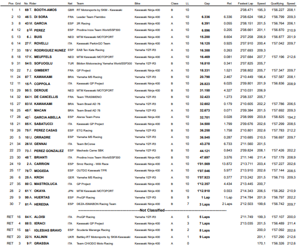 Mika Perez (Prodina Ircos Team WorldSSP300), beffato nel finale chiude quarto, a precedere il leader del mondiale Jeffrey Buis (MTM Kawasaki MOTOPORT) e Filippo Rovelli (Kawasaki ParkinGO Team), autore di un fantastica rimonta. Victor Rodriguez Nuñez brilla con il passaggio all’EAB Ten Kate Racing. Spazio in top10 nell’ordine anche per Koen Meuffels (MTM Kawasaki MOTOPORT), Bahattin Sofuoglu (Biblion Motoxracing Yamaha WorldSSP300) e Johan Gimbert (GP Project).