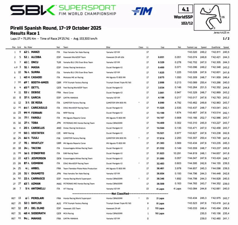 Nonostante l’assegnazione del titolo, il Campionato del Mondo FIM Supersport continua a regalare colpi di scena e spettacolo, ma con un unica costane: Stefano Manzi (Pata Yamaha Ten Kate Racing), già incoronato campione, ha confermato la sua supremazia centrando una fantastica vittoria. Alle sue spalle, un fantastico Jeremy Alcoba (Kawasaki WorldSSP Team) al secondo podio della carriera, mentre Can Oncu (Yamaha BLU CRU Evan Bros Team) ha potuto beneficiare di una penalità comminata a Jaume Masia (Orelac Racing VerdNatura) per track limits e salire così sul podio.