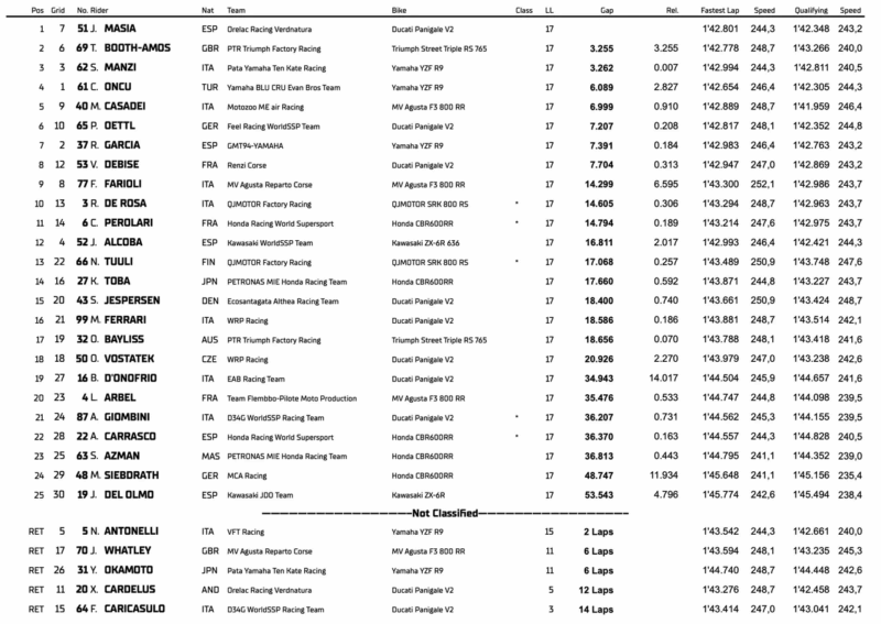 Da segnalare la scivolata di Niccolò Antonelli, mentre lottava in per le posizioni alle spalle del podio. Sorte analoga anche per l’ex-Moto3 Whatley, in pista con la MV Agusta e Federico Caricasulo (D34G WorldSSP Racing Team).