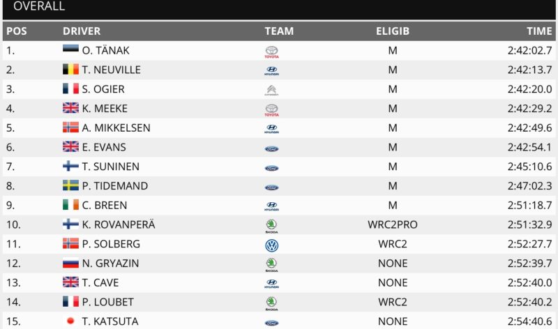 In settima posizione c’è Teemu Suninen, a seguire Pontus Tidemand in ottava piazza. Nona posizione per un Craig Breen che si è cappottato ad inizio giornata, chiude la top 10 un Kalle Rovanpera sempre più dominatore in WRC2PRO con Skoda. Per le R5 private è Petter Solberg a comandare la gara del WRC2 davanti a Loubet e Fourmaux, mentre il nostro Fabio Andolfi occupa la quinta posizione di classe.